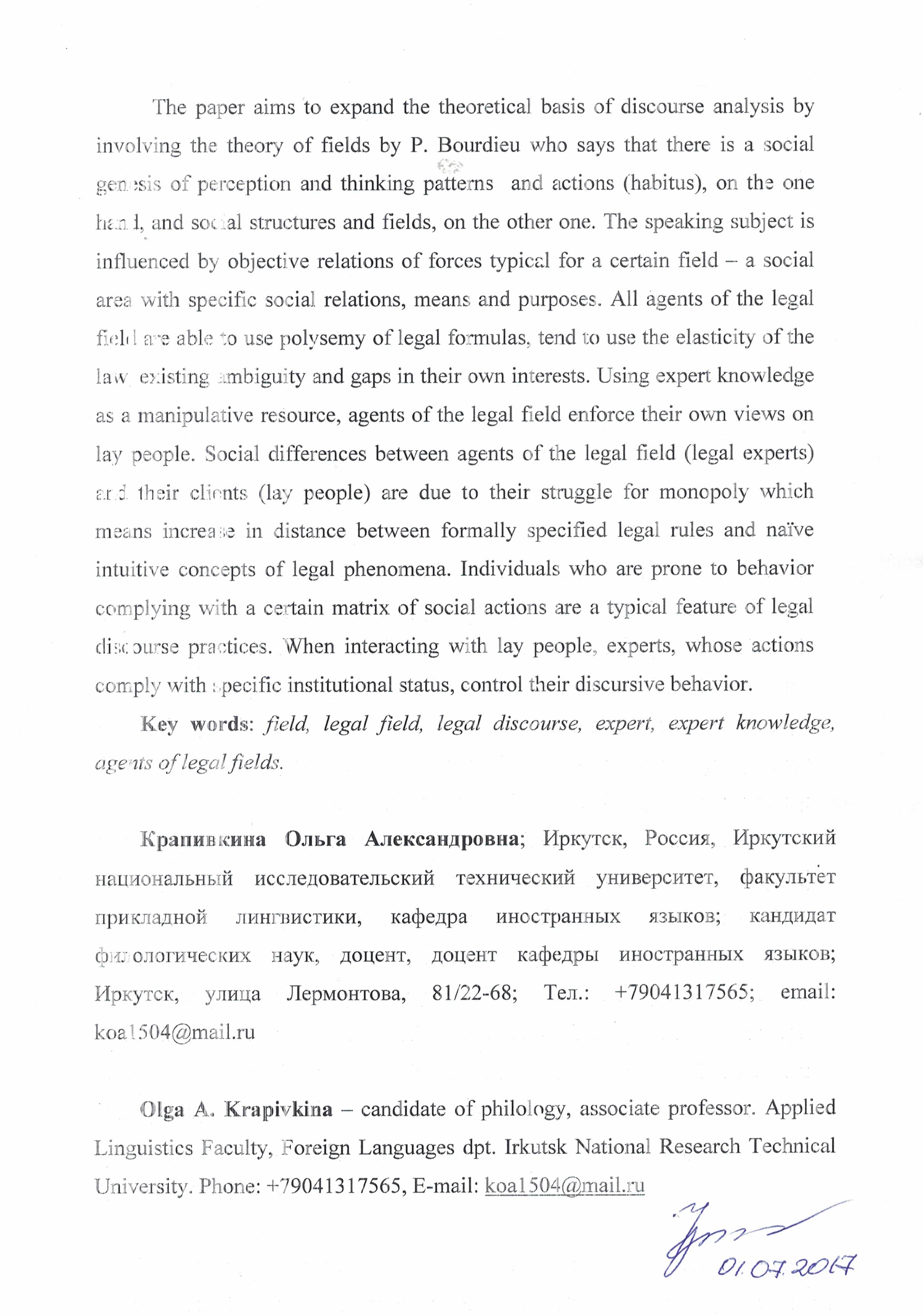 Krapivkina, O. A. (2017). Theory of Social Space by P. Bourdieu as a Theoretical Background for Studying Discourse Practices in the Legal Field. Proceedings of Southern federal university. Philology. 4, 180‒115.